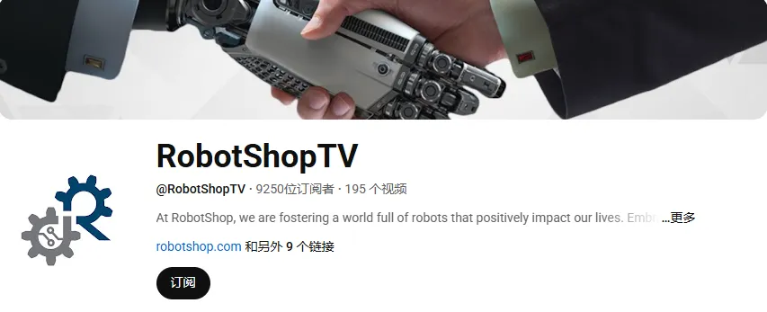 YouTube 机器人垂类媒体 @RobotShopTV,粉丝约 9.2K,账号长期聚焦 机器人产品、展会探馆、硬件演示,整体风格偏专业直观。