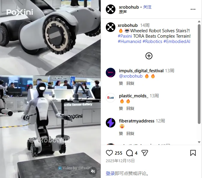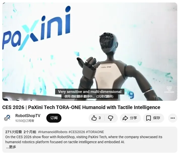 其视频围绕 CES 2026 | PaXini Tech TORA-ONE Humanoid with Tactile Intelligence展开,这条内容以 TORA-ONE humanoid + tactile intelligence 为核心卖点,结合展会现场 booth 探馆形式,直接把帕西尼最关键的“触觉感知 + 人形机器人执行能力”呈现给机器人垂类受众。当前视频播放量约200+,虽不高,但受众精准,能够有效帮助帕西尼完成“展会亮相—技术解释—行业种草”的传播闭环。
