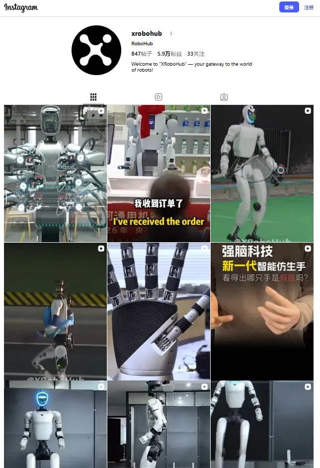 而在 Instagram 更适合承担“快速吸睛、放大展会亮点、补充行业曝光”的作用。Instagram 机器人资讯号 @XRoboHub(目前约有 60K followers),账号核心定位是机器人、AI、自动化与 humanoid 相关的短视频资讯分发,整体风格更偏“短平快亮点捕捉”。