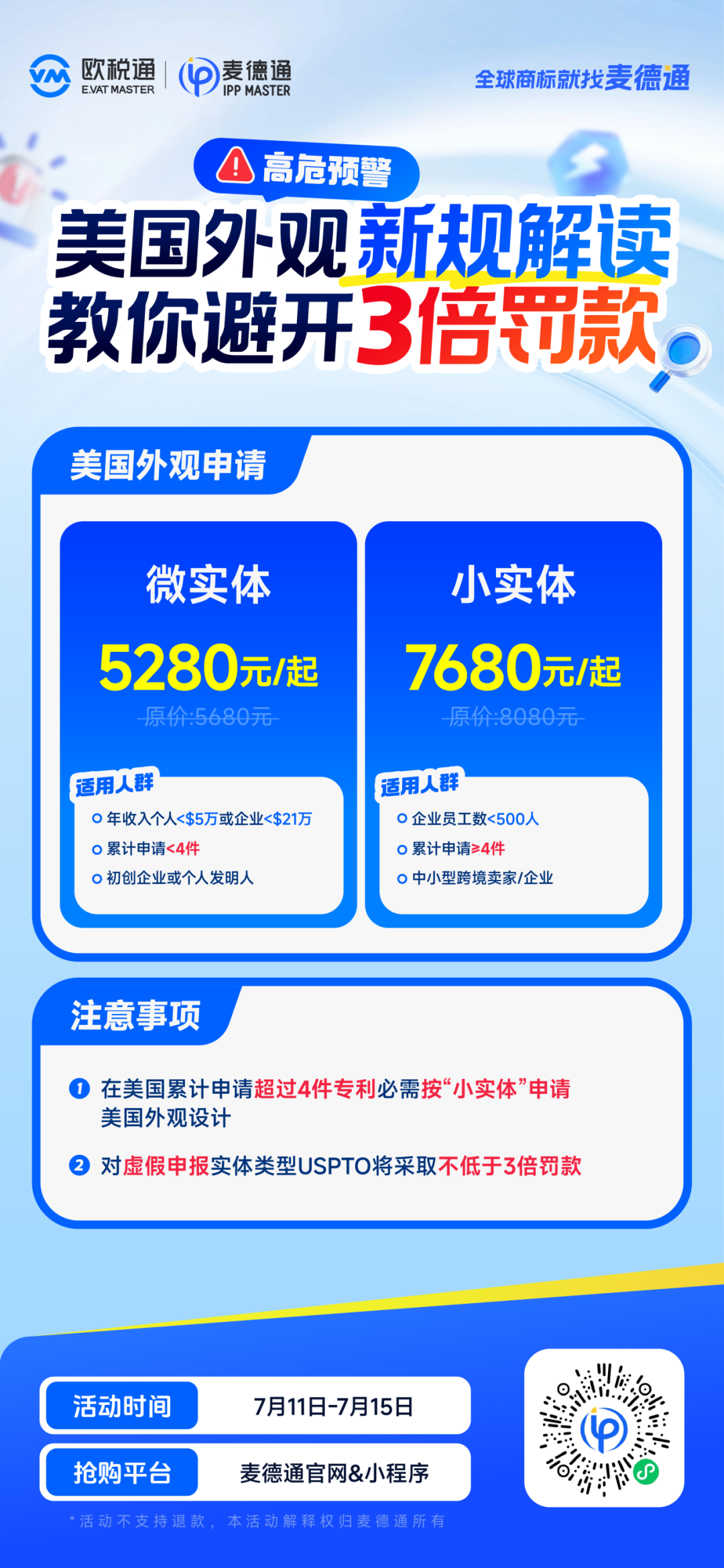 若你有美国外观专利申请的还有任何问题欢迎联系麦麦咨询~麦德通始终坚守申请资料真实、流程合规的原则,为你的知产合规保驾护航!