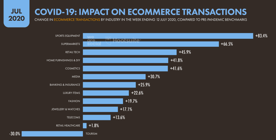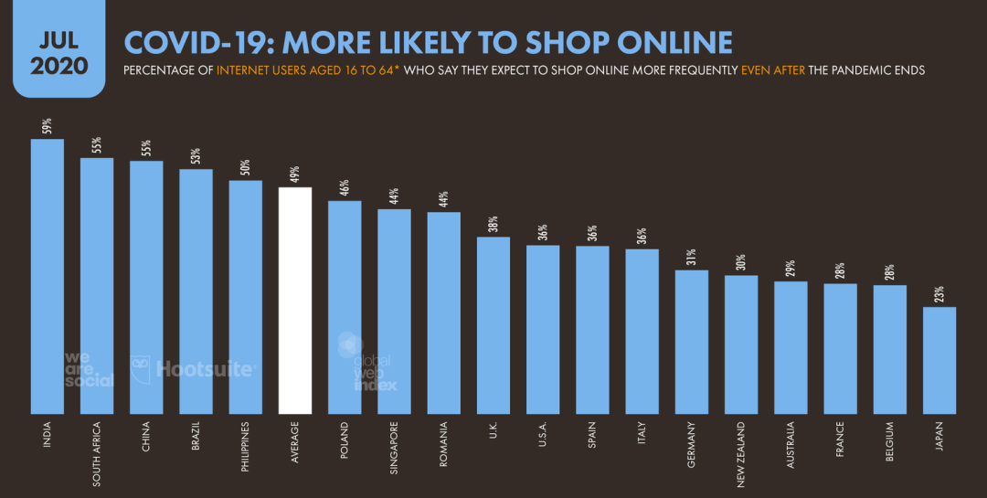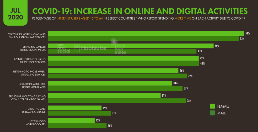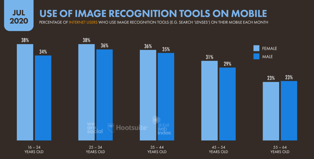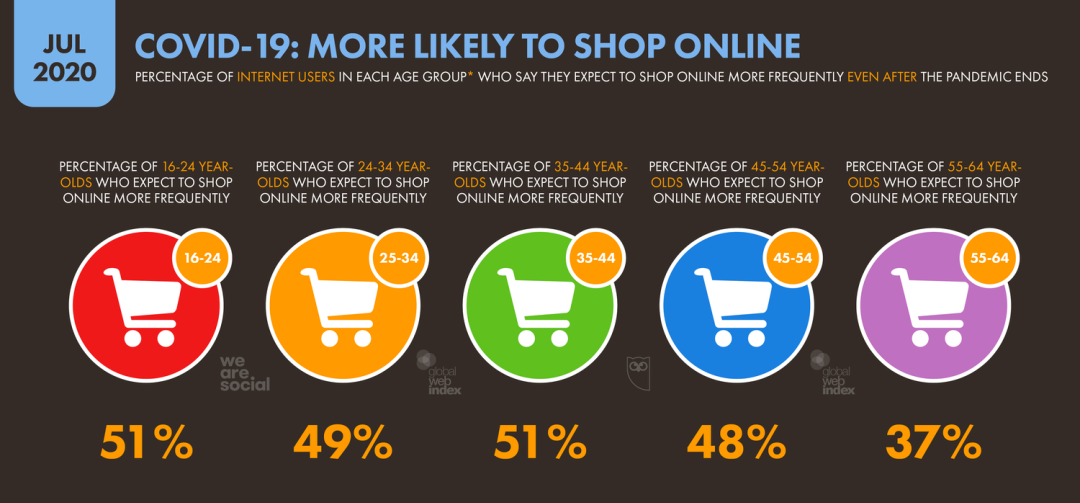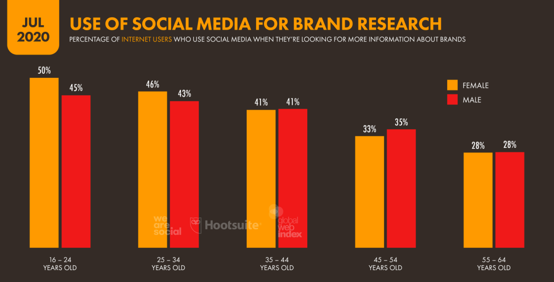 全球有超过一半的人正在使用社交媒体 在过去一年中,社交媒体的用户数量增长超过了10%。截至2020年10月初,全球共有39.6亿人正在使用社交媒体。这也是全球社交媒体用户首次达到全球一半人口的规模。在过去12个月中,每天平均有超过100万人首次使用社交媒体,相当于每秒增加近12个新用户。与此同时,全球移动端社交媒体用户正在急剧增长。 全球社交媒体活跃人数 用户使用社交媒体的时间增长 最新的报告显示,尽管许多国家取消了社交隔离禁令,但用户在互联网冲浪的时间仍在持续增长。与疫情发生之前相比,70%的互联网用户花费更多时间在手机上,而50%的用户花费更多时间在笔记本电脑上。 因疫情影响,用户在各项设备上花费时间占比 同时,用户对流媒体的热爱仍在持续。超过一半的调研受访者表示,与2020年初相比,他们目前会在互联网上观看更多的电影、电视等视频节目。与此相似,40%的受访互联网用户表示,他们在使用社交媒体上花费更多的时间,而超过14%的受访者表示他们会在社交媒体上创作更多的视频内容。 因疫情影响,用户在各项活动上花费时间占比 在社交隔离禁令被实施期间,互联网给了人们更多选择,改善了他们的生活质量。80%的受访者表示,互联网帮助他们应对了疫情,使他们能够支持子女的教育(76%),与朋友和家人保持联系(74%),甚至改善了心理健康,提升了幸福感(43%)。 因疫情影响,数字化媒体在人们生活中起到的作用 用户搜索行为在不断变化 最新的数据表明,语音搜索交互功能的使用率正在急剧增加,尤其是在一些新兴的互联网市场。在中国、印度和印度尼西亚,目前有超过50%的互联网用户每个月都会使用语音搜索交互功能,而印度每10个用户中就有6个在过去30天内使用了语音交互功能。 语音搜索与语音指令功能的使用情况 除此之外,图像识别功能也越来越受到互联网用户的欢迎,尤其是年轻用户。在过去一个月中,超过33%的主流互联网用户(16岁至64岁)使用了图像识别功能。这些功能在电商领域的应用特别重要,尤其对时尚、家居装饰等类型的品牌。 手机图像识别功能的使用情况 报告显示,最重要的变化是用户进行搜索行为的渠道发生了改变。报告发现,社交媒体在人们了解品牌和产品信息中扮演着越来越重要的角色,仅次于搜索引擎。而与此同时,两者之间的差距也在最近几个月中持续缩小,这表明人们寻找商品信息的方式正在发生改变。 在了解品牌信息上,社交媒体已成为16岁至24岁互联网用户的首选渠道,甚至超过了搜索引擎。大量的年轻女性倾向于利用社交媒体来了解品牌信息。因此,营销人员必须更广泛地考虑到目标用户和消费者希望从哪些渠道了解品牌信息以及如何将利于搜索的品牌信息融入到社交媒体宣传中。 用户在社交媒体上的品牌搜索情况 Instagram和LinkedIn的用户群,达到新的里程碑 根据Facebook的数据,Instagram的用户量已超过10亿,其中51%为女性,49%为男性。上一季度,Instagram增加了1.11亿新用户,比第一季度增长了10%。这些数据意味着Instagram的用户群正在以每天超过100万人次的速度增长,品牌投放广告时也能覆盖到更广泛的用户群。通过Instagram进行广告投放,市场营销人员可触达的13岁以上人口占比达到18%。 Instagram广告目标用户概览 LinkedIn的注册用户也达到了一个新的峰值,目前拥有全球超过7亿用户,其中43%为女性,57%为男性。通过LinkedIn广告投放,市场营销人员可触达的18岁以上人口占比达到13%。过去3个月中,平台全球用户增长了2500万,比第一季度增长了近4%。 LinkedIn广告目标用户概览 线上电商交易量持续增加 在本次报告中,我们发现了这一趋势:即使新冠疫情逐渐得到控制,但线上电商的影响力仍持续增强。与2020年年初相比,7月整体的电子商务交易量增长了约20%,转化率增加了21.6%。 受疫情影响后的全球电子商务概况 报告指出,自社交隔离禁令开始慢慢取消以来,每周的在线交易数量一直在稳步下降,特别是在人们可以重返实体店购物之后,但线上的转化率仍在不断提高。同时,我们也可以看到,一些社交媒体平台也在紧锣密鼓地进行电商功能的更新。 几乎所有的互联网用户都希望在疫情结束后仍能更多地使用电商购物。在发展中国家,消费者在线购物的倾向较高,全球范围内期望日后线上购物的用户占比平均为49%。与四月的数据相比,年龄较大的用户在线上购物倾向上有所增长。约50%的16-44岁的用户希望之后能够更多进行线上购物,而在55岁至64岁的互联网用户中,37%的用户表示希望在疫情结束后更加频繁地进行电商购物。 受疫情影响,各国用户的线上购物倾向 受疫情影响,期望线上购物的用户年龄分布 几乎所有类别的电商交易都有所增加,运动器材品牌和线上超市的增长势头尤为强劲。 疫情对于电商交易的影响