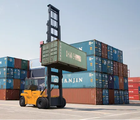 进口重柜堆场配备轮胎式龙门吊(图中蓝色门形器械),用于堆高和提箱操作。记住它!它很重要!