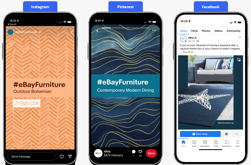#eBayFurniture主题宣传活动已登陆Instagram, Pinterest, Facebook等多个社交媒体平台,通过社交软件、邮件推广和直播等多种途径推广eBay家居品类,吸引更多潜在买家的关注。