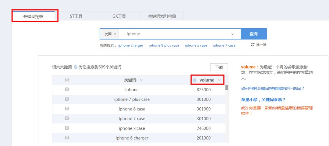 如上图,选择美国站,输入iphone。查询出来的词是iphone衍生词,也就是长尾词。相关关键词中的volume指的是最近一个月谷歌搜索指数,指数越大,代表用户搜索量越大。选择volume指数高的关键词、符合产品定位的关键词,放置在标题、ST、五点描述中,比较有针对性。