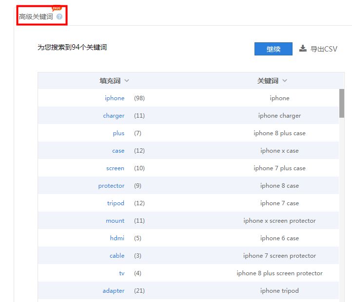 高级关键词是在亚马逊搜索框上用户爱搜的关键词,其中有很多用户爱搜但竞争对手想不到的独特的词。导出CSV,在表格中进行筛选。