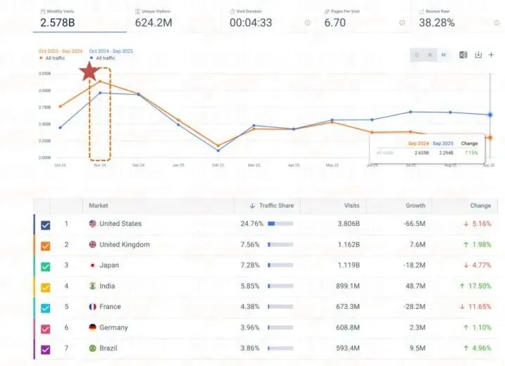 根据报告数据显示,2025年9月服饰行业流量同比增长15%,主要得益于秋季上新与换季促销启动。美国依然是流量核心,占全球24.7%,但印度和英国等新兴市场增长更快。