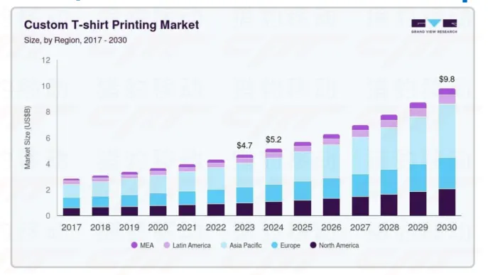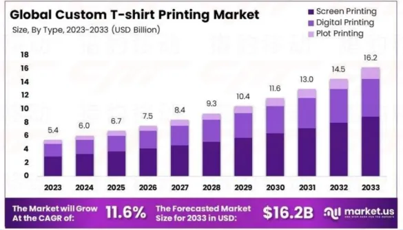 1️⃣ 定制T恤印刷市场年增10%,预计2030年将达98亿美元。消费者偏好小批量、原创设计与环保材质(有机棉、水性墨水)。