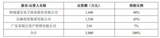 据了解,该合资公司注册资本为人民币 3000 万元,其中:跨境通注册资本占注册资本总额的 48%,汉麻集团占注册资本总额的 45%,英锐行资产占注册资本总额的 7%。