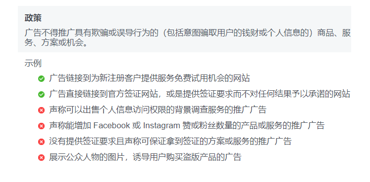 5月份政策系统进行更新,“ 禁止的商业行为“广告政策规定, 广告不得使用欺骗性或误导 性手段来促销产品、 服务、 方案或优惠,包括旨在骗取他人金钱或个人信息的手段。当发现广告违反了广告政策(包括使用误导性或欺骗性的做法)时,其广告将被拒绝。如果屡次违反这些政策,可能会导致帐户或公共主页被删除。