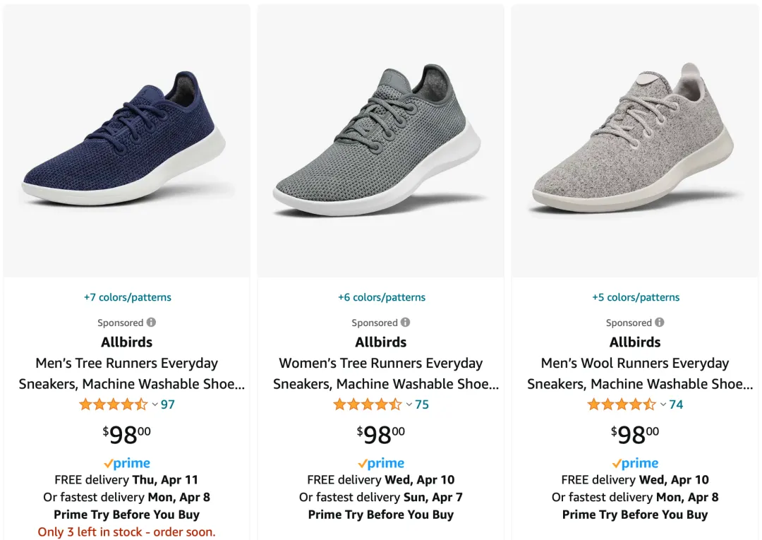 Allbirds创立的头几年主要通过自有品牌网站以及线下门店销售,后来上架了亚马逊。自带流量的Allbirds,很快就成为亚马逊休闲鞋类目的头部品牌。