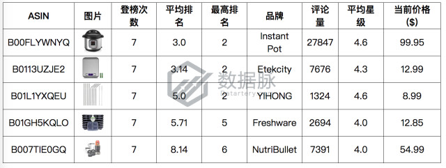 可以看到,在上周Kitchen & Dining品类的Best Seller榜单中,骆探长(shujumai.com)发现,本期综合排名前二的商品未有变化,品牌Instant Pot的多功能压力锅五度进入榜单前三,凭借平均排名3.0的表现,荣膺综合排名第一;