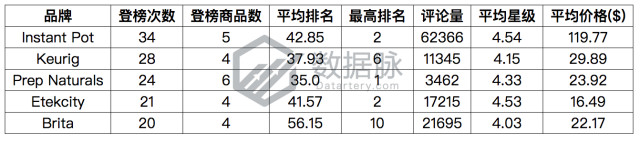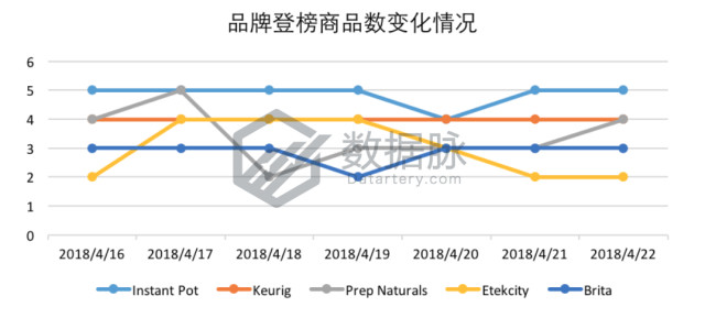 可以看到,在上周Kitchen & Dining品类的Best Seller榜单中,骆探长(shujumai.com)注意到,压力锅品牌Instant Pot登榜5款商品,以总登榜34次位列品牌排名首位;咖啡机品牌Keurig每日登榜4款商品,凭借累计登榜28次不俗表现,暂居品牌排名第二;食盒品牌Prep Naturals共有6款商品登榜,累计登榜24次,位列品牌排名第三;厨房用品品牌Etekcity凭借登榜4款商品,累计登榜21次,位列品牌排名第四;饮用水净化品牌Brita以每日登榜4款商品,累计登榜20次,位居品牌排名第五。