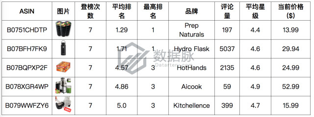 根据上周 Movers & Shakers 榜单上商品的登榜次数及平均排名,骆探长对登榜的商品进行了排序,其中排名靠前的五款商品如下所示: