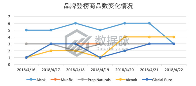 骆探长(shujumai.com)发现,Kitchen & Dining 品类的 Hot New Releases 榜单中,厨房小家电品牌Aicok连续6日登榜至少5款商品,登榜商品数稳定,上周登榜8款商品,累计登榜36次,位列品牌排名第一;婚礼杯具品牌Munfix在上周每日登榜3款商品,累计登榜21次,暂居品牌排名第二;食盒品牌Prep Naturals有3款商品登榜,共登榜20次,位列品牌排名第三位;榨汁机品牌Aicook、冰箱水过滤器品牌Glacial Pure分别凭借4、5款商品登榜,分别登榜18、16次,依次位列品牌排名第四、五位。