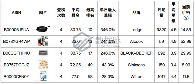 在上周Kitchen & Dining品类的Movers & Shakers榜单中,骆探长(shujumai.com)发现,本期综合排名前五的商品均只登榜四次,品牌Lodge的平底锅以平均排名30.75位列综合排名第一,同时其单日最大涨幅为346.0%;
