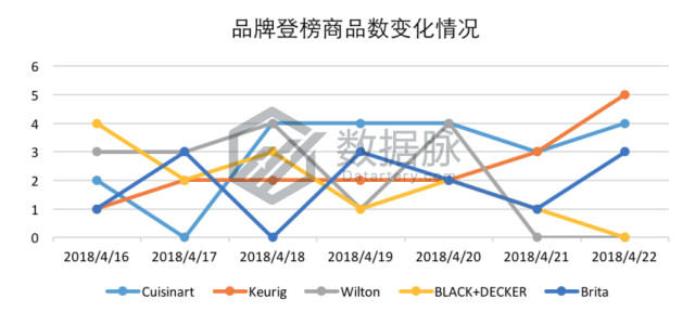 骆探长(shujumai.com)发现,在上周Kitchen & Dining品类的Movers & Shakers榜单中,品牌之间竞争激烈;厨房小家电品牌Cuisinart凭借登榜16款商品,共计登榜21次,蝉联品牌排名首位;咖啡机品牌Keurig登榜8款商品,登榜17次,位列品牌排名第二位;烘焙品牌Wilton共有登榜7款商品,以登榜15次,位列品牌排名第三。