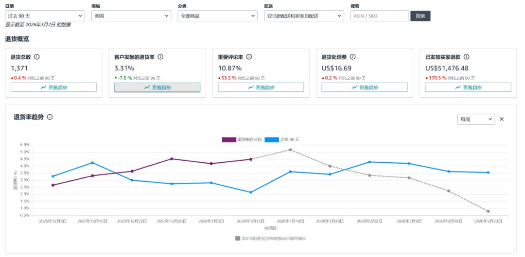亚马逊AI退货看板,全称是“退货与价值回收:洞察与机遇”,是卖家平台新上线的工具,靠AI系统深度分析退货模式和买家反馈,从大盘数据到精准洞察,一站式搞定退货分析。
