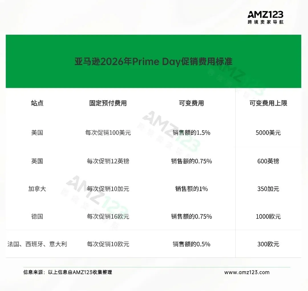公告显示,亚马逊2026年Prime Day的促销费用将采用“固定预付费用+可变费用”的绩效型收费模式,针对美国站、英国站等不同站点的收费标准不同,具体费用细则如下: