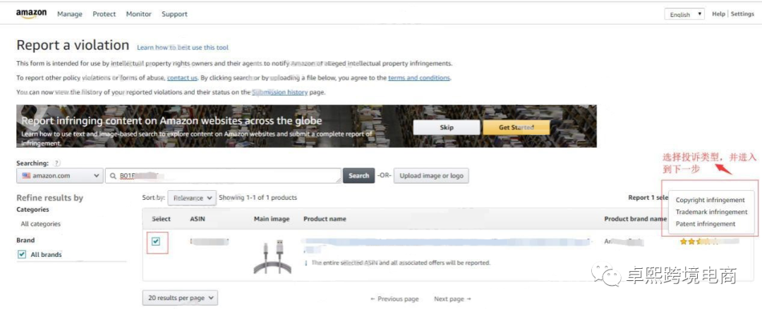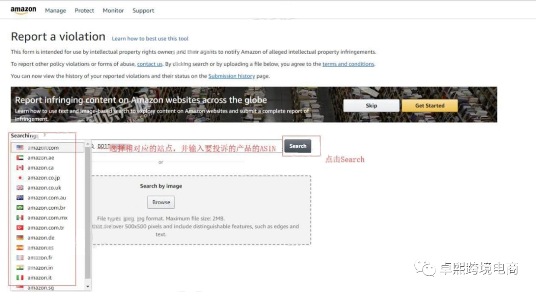 二、选择对应的国家和站点,输入要投诉的ASIN号,支持用图片搜索;