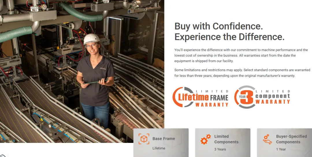 Douglas Machine提供3年有限组件保修与终身框架保修服务,尤其是终身框架保修,直接回应了客户对结构稳定性的核心顾虑。需要注意的是,保修政策不仅是成本投入,更是一种“风险共担声明”。当供应商愿意承担更长期的责任时,客户自然更愿意建立长期关系。