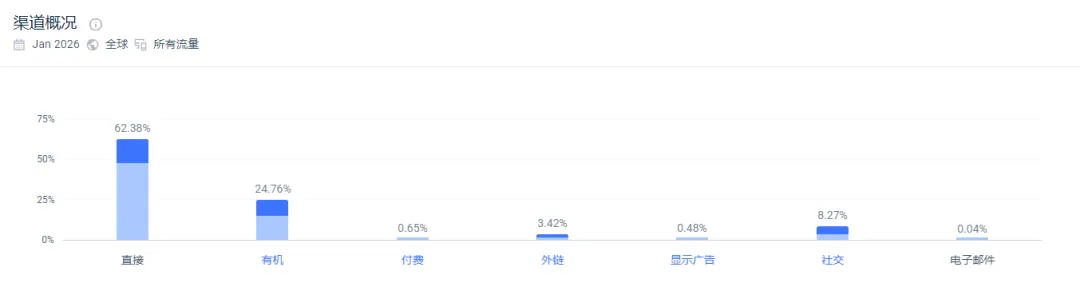 根据similarweb数据显示,Douglas Machine官网的流量来自于直接访问流量(62.38%)、自然搜索流量(24.76%)、社交媒体(8.27%)。从结构上看,高比例直接访问说明品牌心智已建立,稳定的自然流量,则意味着内容布局有效覆盖了行业需求。