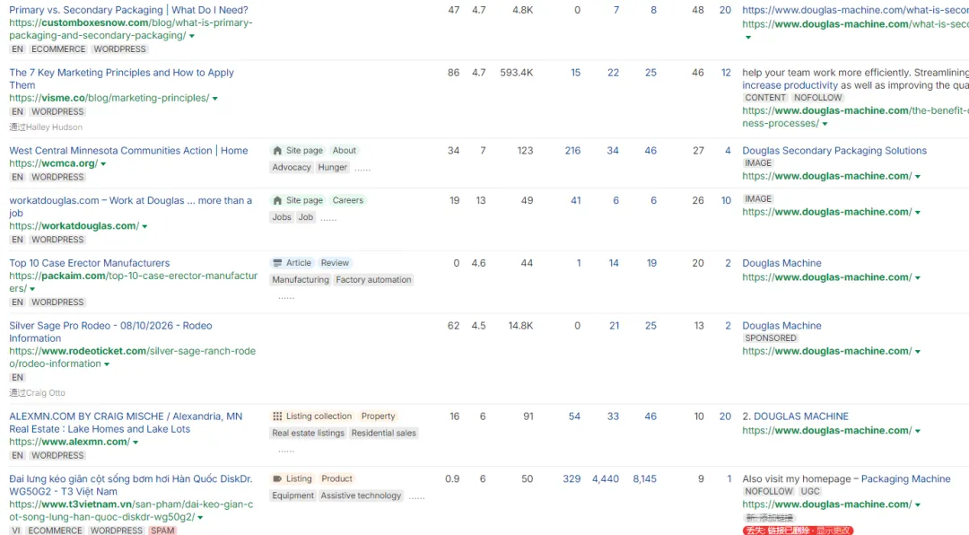 Douglas Machine的外链来源包括行业协会、新闻网站、地方活动网站及招聘页面,覆盖多个渠道。Sopro 数据显示,在联系供应商前,B2B买家平均浏览11篇内容,其中72%从网上开始搜索。这意味着,线上内容往往是合作前的第一道筛选机制。