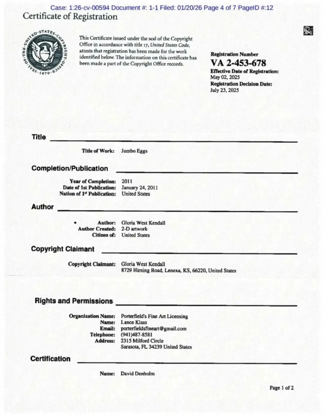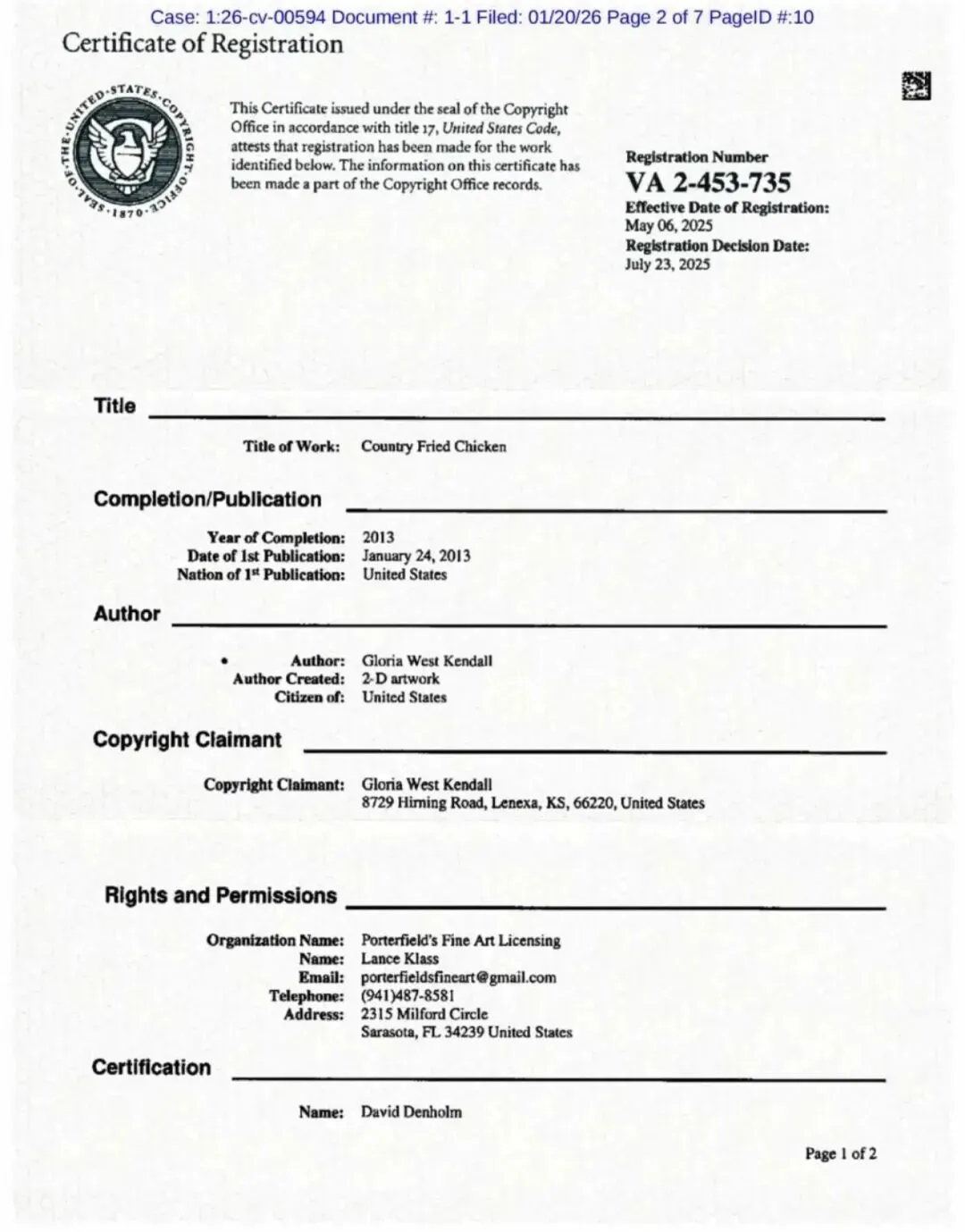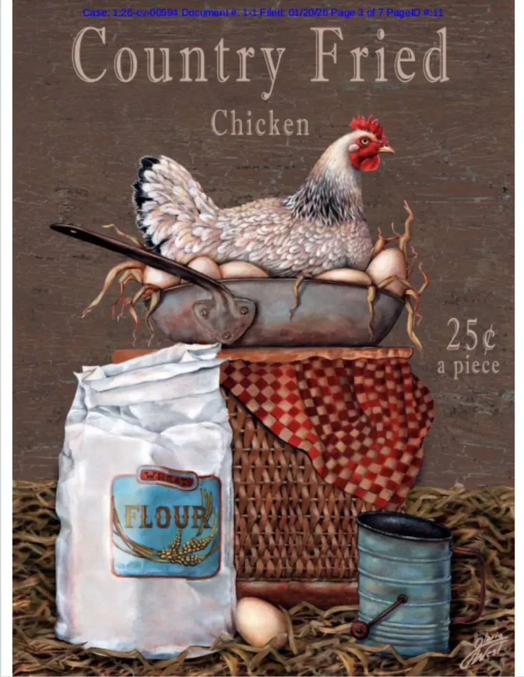 【26-cv-00594】Gloria West Kendall乡村鸡插画版权维权!跨境卖家速看避雷!