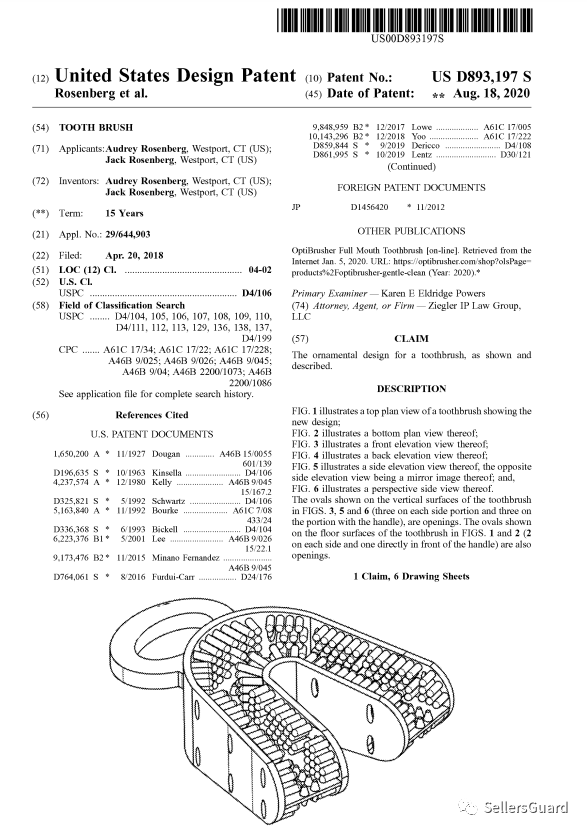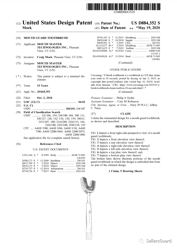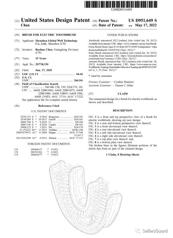 据美国专利局公布的资料,我们关注到一款全新洁牙器外观专利于2023-06-06日正式生效: