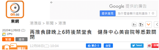 港媒:港府将防疫措施收紧至最严厉程度,晚6点后禁堂食,健身中心美容院等关闭。