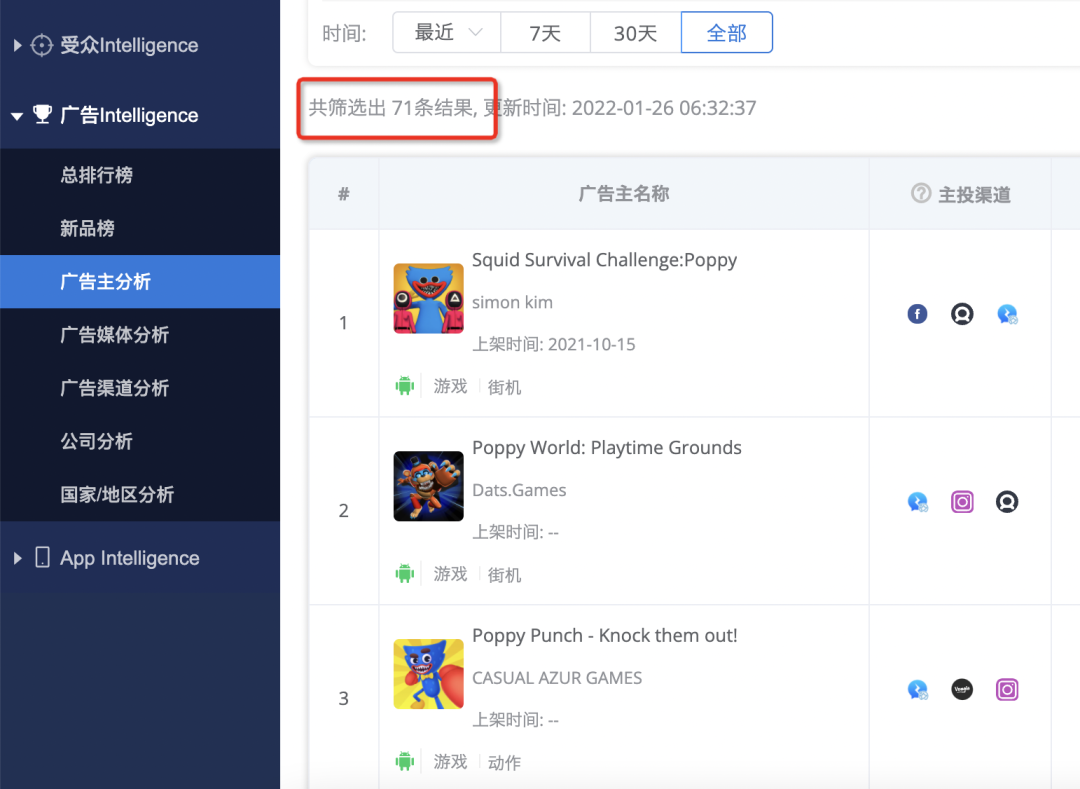 根据广大大-广告主分析功能抓取到数据发现,截至2022年1月26日,与关键词“poppy”相关的广告主已经有71款。“poppy”到底有什么特殊之处,能获得与【鱿鱼游戏】相同的待遇呢?得先从它的走红之路说起。