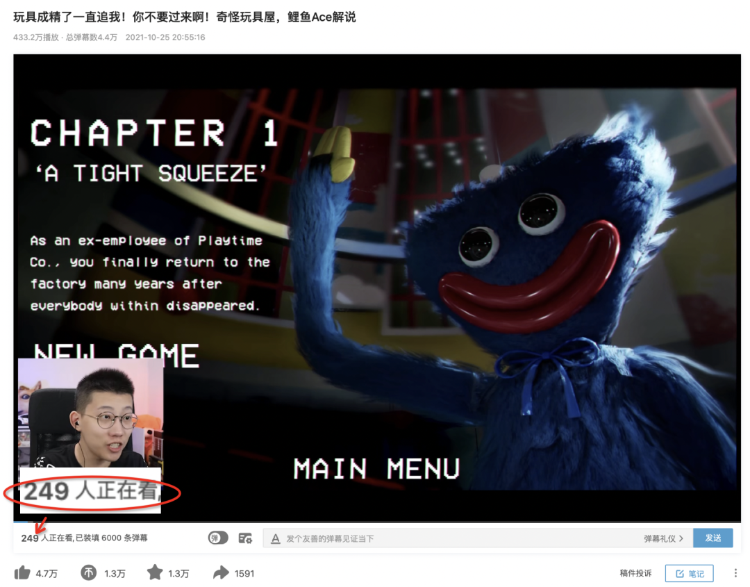 笔者分别在B站和YouTube上搜索了【Poppy Playtime】的关键字,B站上播放最高的一条视频播放量达到了430万,点击播放后发现,即使距离视频发布日期已经过去了3个月,还依然有249个小伙伴正在观看。
