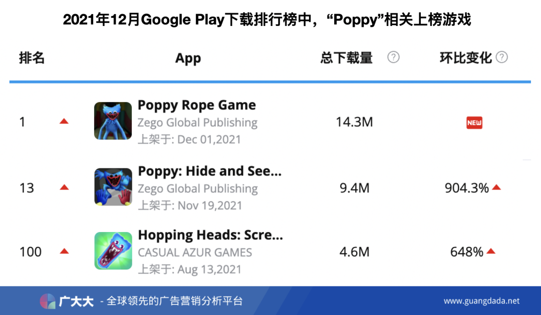 根据广大大-App Intelligence功能可以看到2021年12月Google Play下载排行榜,其中“poppy”相关的衍生游戏就有3款上榜,排名第一和第十三的2款产品均来自越南厂商Zego Studio,下面笔者将以【Poppy Rope Game】为例,分析一下该产品的登顶秘诀。