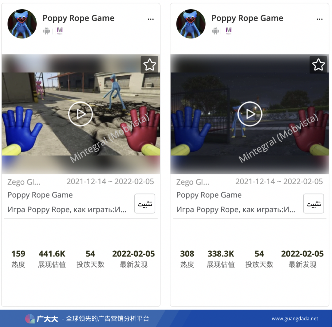 观察其投放的广告素材,在一部分视频和图片上,都有在封面放上一双红蓝两色的机械手,虽然和PC游戏上的略有区别,但也很容易让玩家只看这双手就会以为“poppy”真出了手游版,从而引发下载转化。当然,这种“货不对版”的模式会让部分玩家感到不快,是否要采用则要看厂商自己的考量。