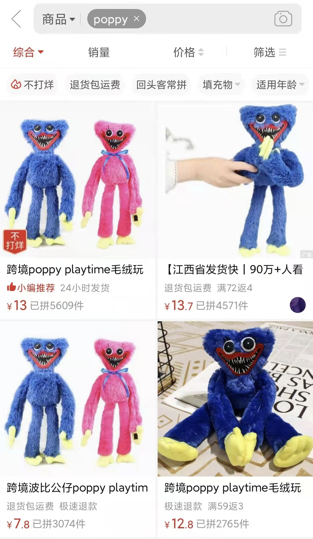 除了游戏之外,“poppy”的相关衍生玩偶也十分受人们欢迎,笔者在拼多多上搜索“poppy”之后,出现了较多的“跨境波比公仔”的搜索结果,且销量都十分不错;结合之前观看过的UP主整蛊视频来看,这类玩偶或许在小朋友之中更受欢迎(用poppy公仔吓人,只有小朋友认出公仔的名字),或许可以成为一个非常不错的选品。