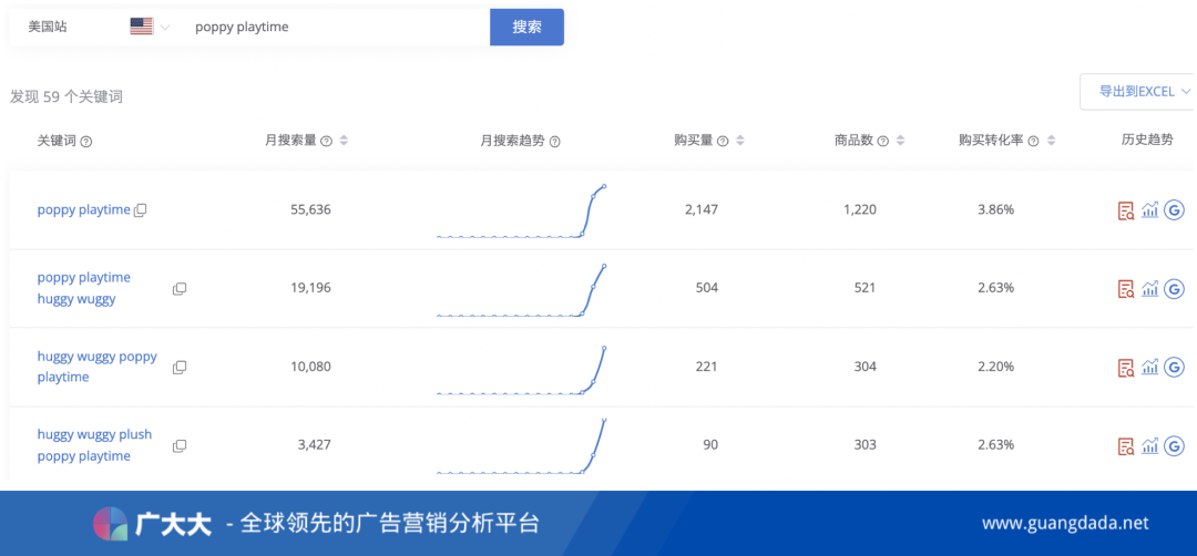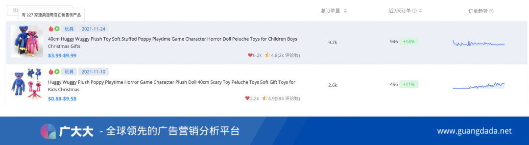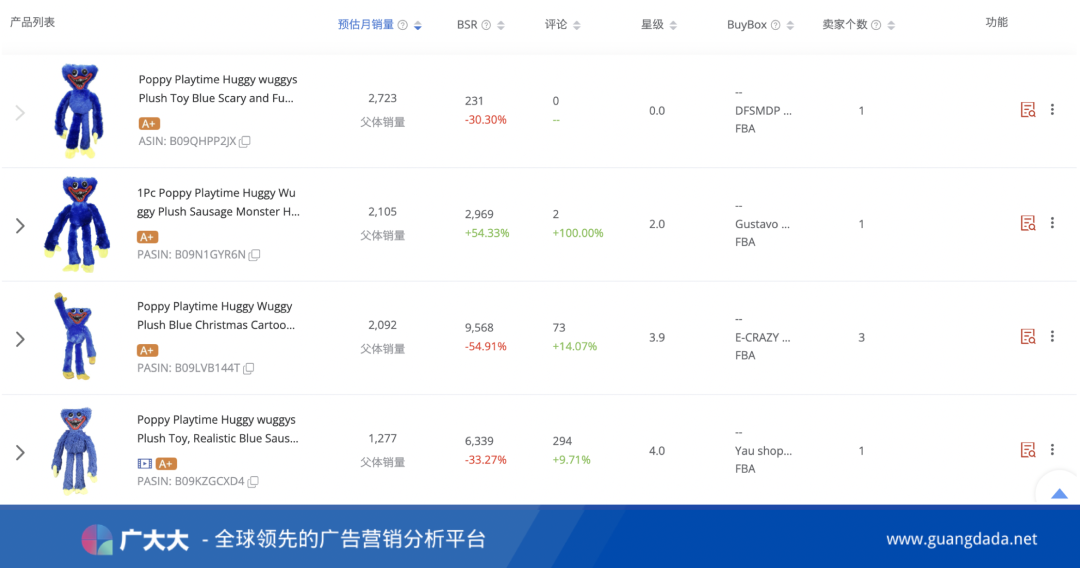 在广大大-电商版检索“poppy playtime”,发现其在亚马逊、速卖通等跨境电商平台呈热卖趋势。在亚马逊,一月内可售出成千上万款poppy公仔,这款造型独特的玩具备受消费者喜爱。