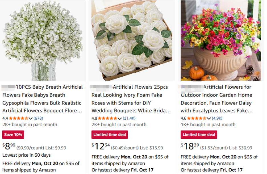 仿真花(Artificial flowers): 仿真花作为一种经久不衰的家居装饰品,在全球拥有庞大且稳定的消费市场。无论是日常的家居美化,还是婚礼、派对等特殊场合的布置,仿真花都扮演着重要角色。尤其在情人节、母亲节等节日期间,其需求量更会迎来一波销售高峰。从市场体量来看,全球仿真植物市场规模预计可达数百亿美元,欧美市场是其中的消费主力,这使得仿真花看上去是一条充满机会的黄金赛道。然而,在这看似美好的市场背后,却隐藏着新手卖家难以承受的重压。首先,仿真花的供应链高度成熟且集中,这意味着上游工厂的议价能力极强,留给卖家的利润空间被一再压缩。更核心的避坑点在于其海量的变体和库存风险。就像亚马逊上一款常见的玫瑰花束,可能有10种不同颜色,每种颜色又分含苞、半开、盛开3种形态,再加上长短两种枝干,一个链接的变体就可能高达60个。如果每个变体按照FBA模式备货50件,总库存就达到了3000件。这种产品的审美潮流变化快,一旦某个款式或颜色不再流行,就会立刻变成滞销品,庞大的库存将直接拖垮卖家的资金链。此外,仿真花普遍属于“泡重”产品,即体积大而重量轻,这将导致FBA的仓储费和配送费异常高昂,进一步侵蚀本就微薄的利润。当Temu这类平台以更具冲击力的低价进入市场时,亚马逊上毫无价格优势的仿真花卖家处境将更加艰难。