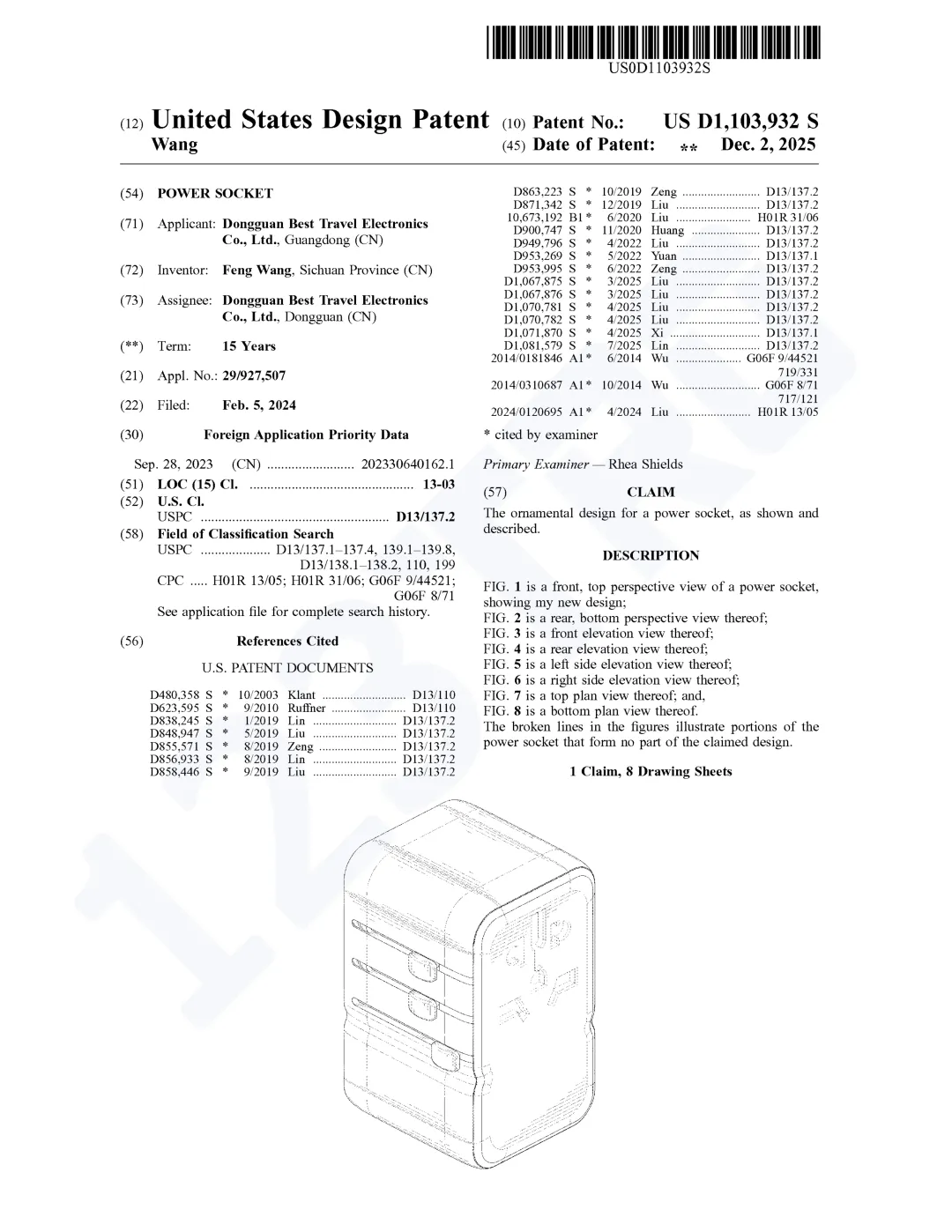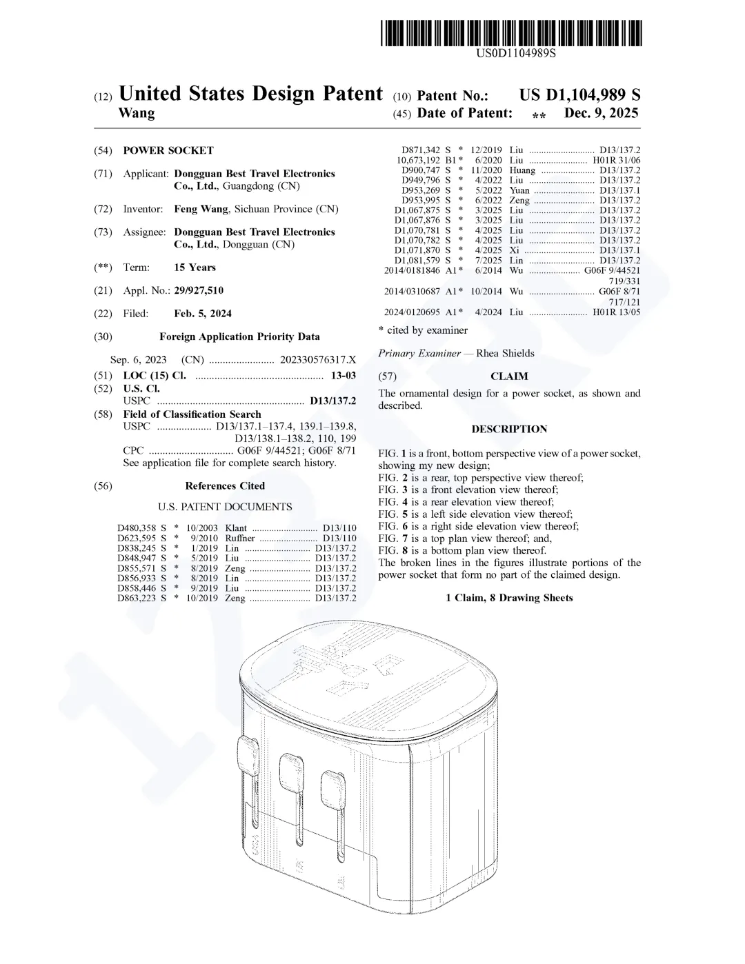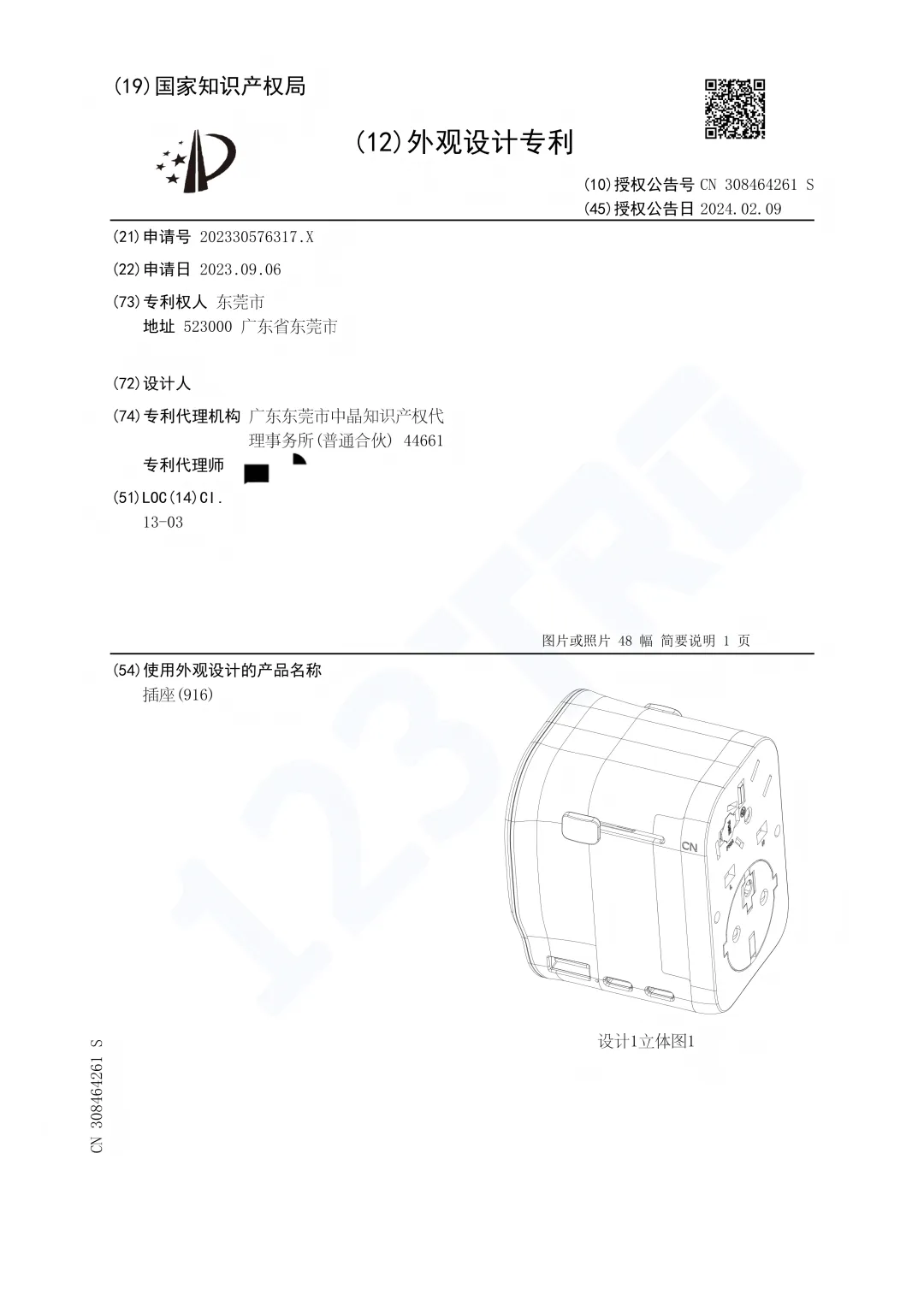 原告名下还有4条美国外观专利,以优先权的方式申请,且都和插座和转换器有关