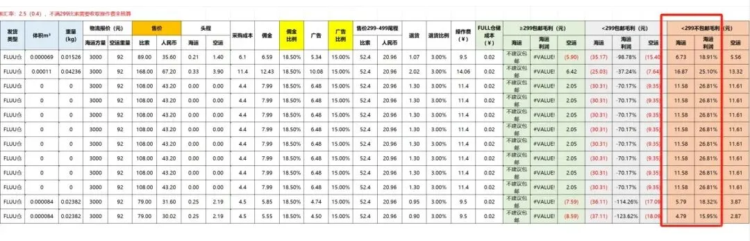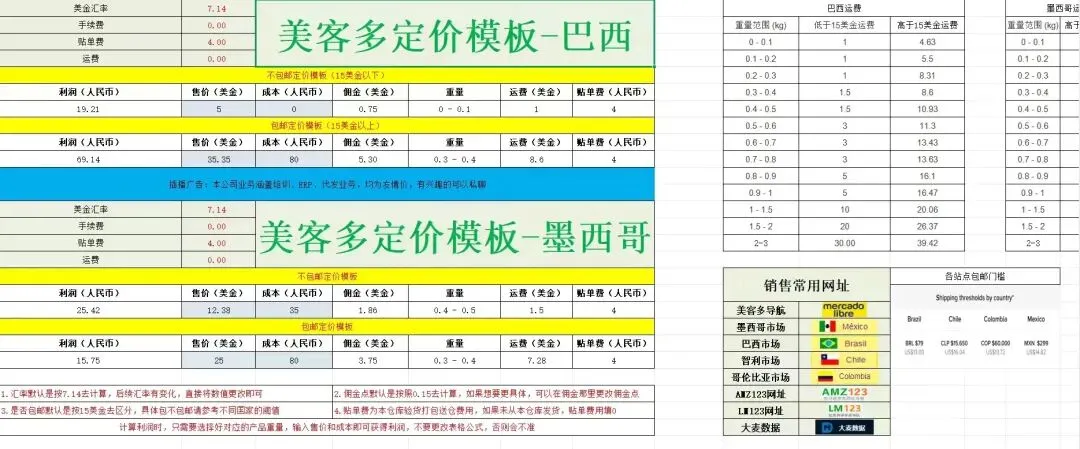 以及两个定价公式的表格版,只需要输入商品的采购价、重量、长宽高等信息,就可以自动计算运费,也可以自动计算指定毛利率的售价和指定售价的毛利率。