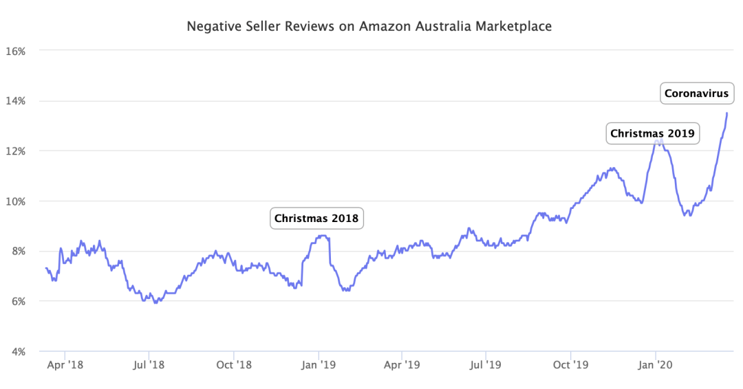 例如下图,亚马逊澳大利亚站在不到四周的时间内,差评率从10.4%增长到13.5%。