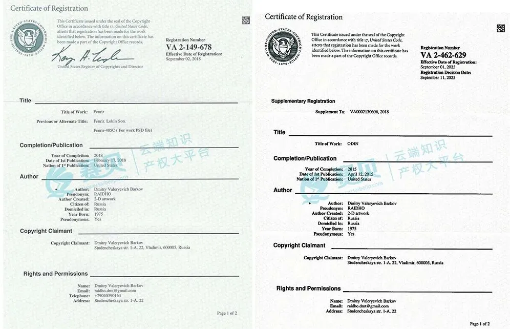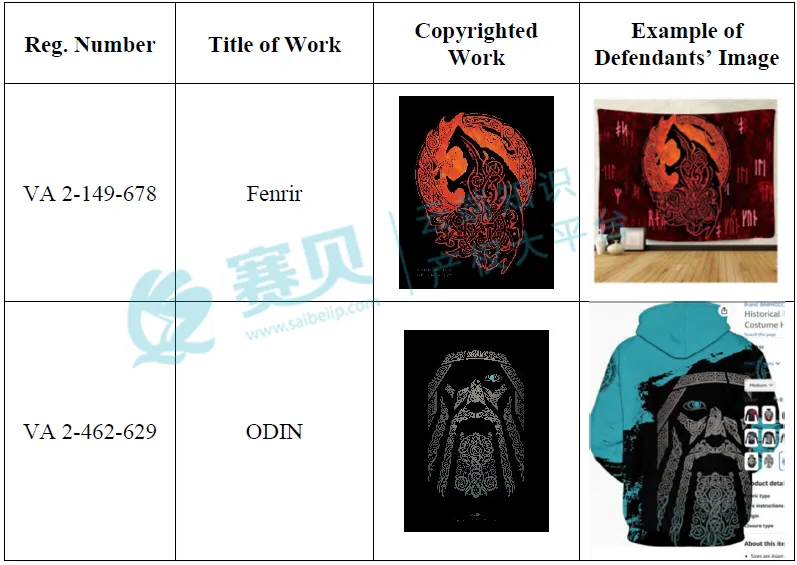 本次维权的两项美国版权对应《ODIN》《FENRIR. LOKI'S SON.》两幅二维艺术作品,以北欧神话人物如奥丁、芬里尔狼为主体。赛贝提醒如果在销售的产品上使用了与这两款作品相同或实质相似的图案,都可能构成版权侵权。
