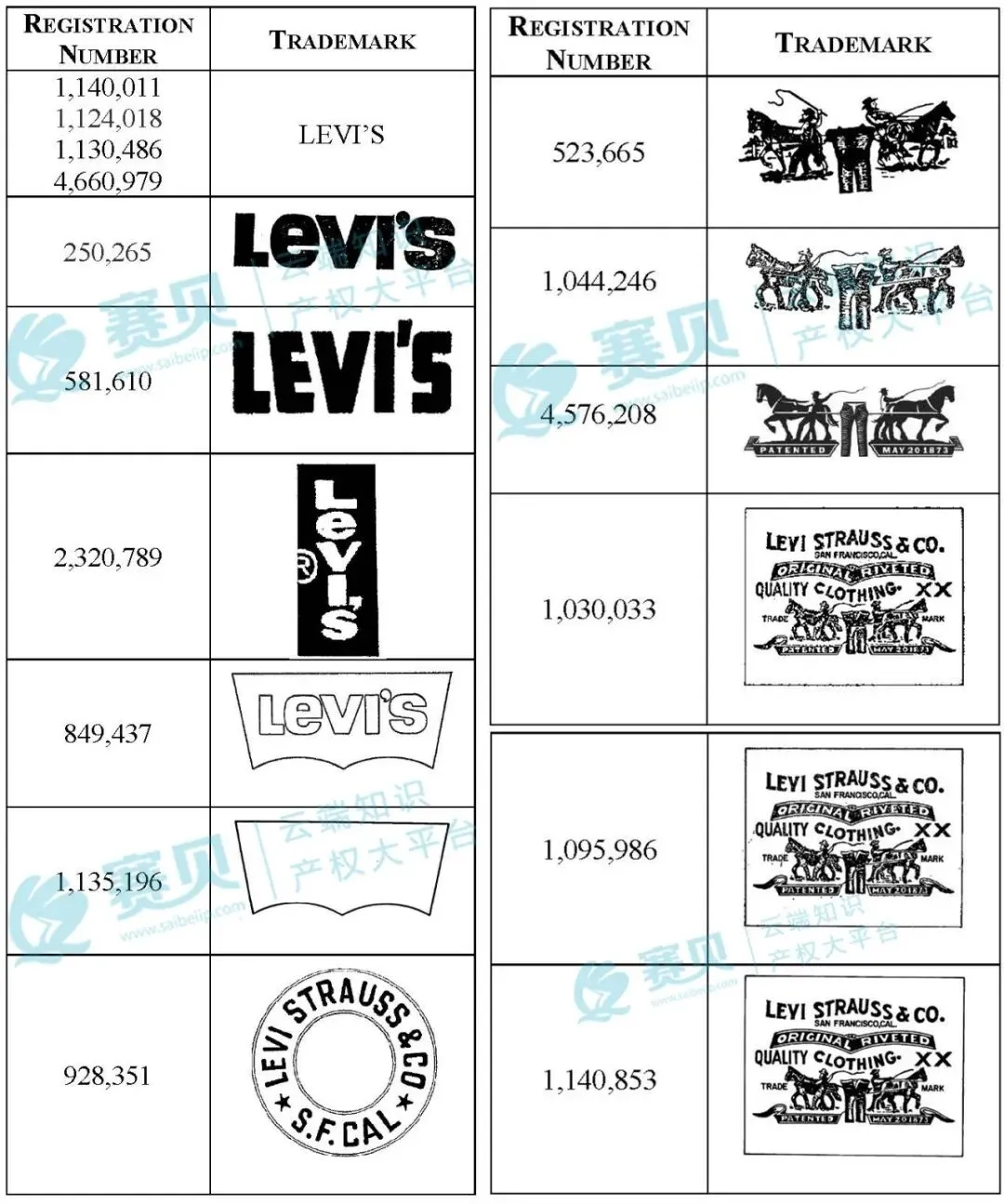·文字商标:核心 LEVI’S® 商标(含多个注册号),是品牌识别的核心;