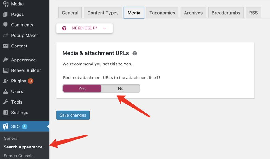 找到yoast seo插件,点击“search appearance”,然后点击media,将这个“media & attachment URLs”选项打开。