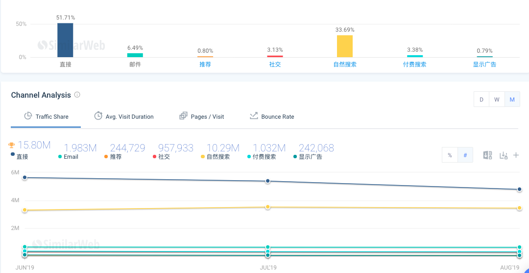 Fitbit品牌独立站的浏览量虽然在近3个月份呈现了较为平稳的状态,8月总浏览人次达到2285万人次,平均浏览时间为接近4分钟,平均浏览页面接近达到4.30页,网站跳出率达到41.86%。