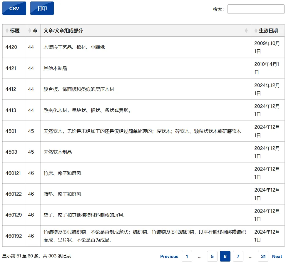 目前需要提交《莱西法案》植物及植物制品进口申报的产品清单可在 APHIS 官方网站查询。APHIS 已在《联邦公报》中发布了第七阶段涉及的 HTS 税号清单,并自 2024 年 12 月 1 日起,对这些税号项下的产品正式要求提交《莱西法案》植物及植物制品进口申报。