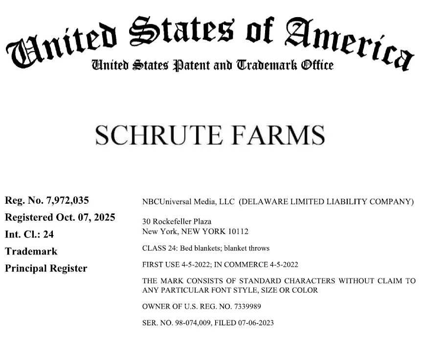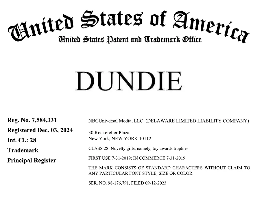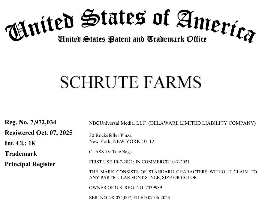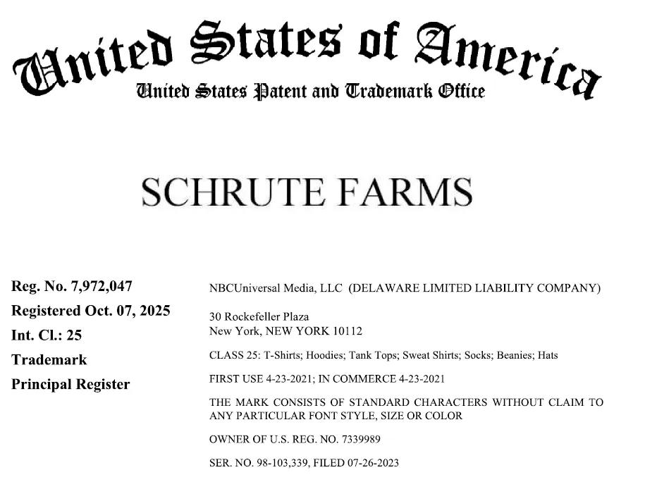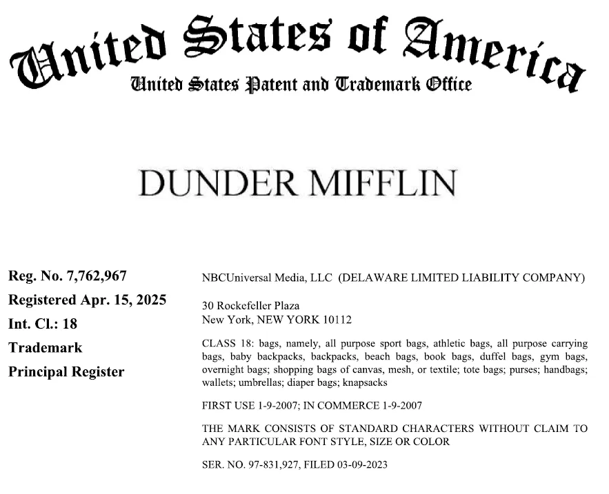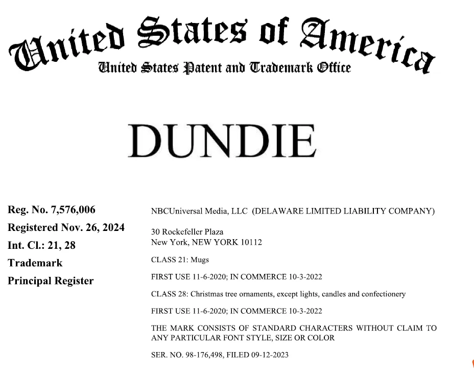 原告 NBCUniversal Media, LLC是一家总部位于美国的全球领先的传媒与娱乐公司。原告最成功的电视剧之一是 The Office,该剧以办公室日常为背景,通过伪纪录片形式展现员工之间的工作与生活,角色形象鲜明、台词梗丰富,是现代电视和喜剧的经典之作,也衍生出大量表情包、周边产品和文化元素。案件涉及商标与剧集相关,近日连发11起新案,预计上千家店铺会中招!