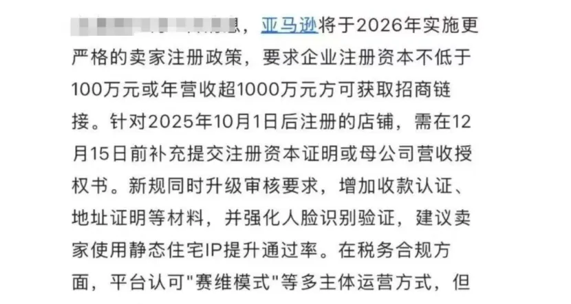 最近,一张关于亚马逊招商标准提高的截图在各大卖家群疯传,核心内容是注册资本需达100万元,或年营收流水达1000万元才能满足某种开店方案。