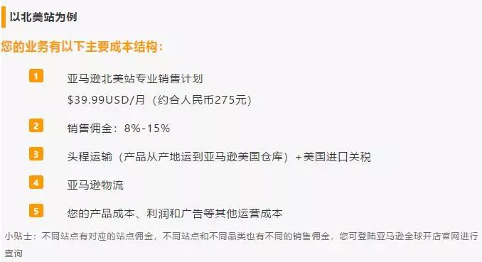 此外,亚马逊还有北美、欧洲、日本、澳洲,印度几大站点,每个站点不同,费用的收取也不同。