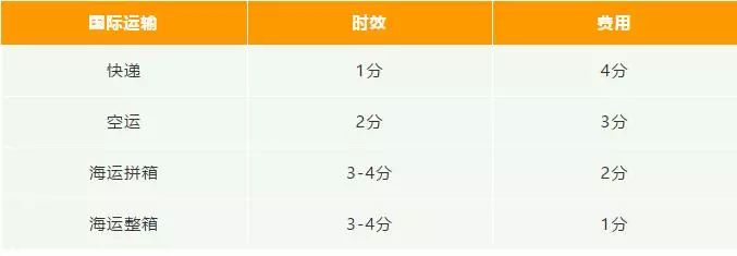 从货源地到亚马逊仓库的这段路程称之为头程,头程运输成本又根据海陆空的时效有价格的高低。以下按照时效由快到慢 & 费用由低到高打分1~4分,给大家直观地展示。