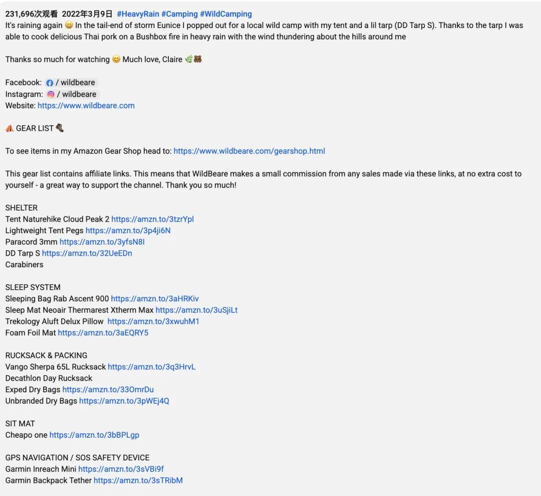 更关键的是,WildBeare在视频描述中直接附上了包括亚马逊在内的联盟购买链接,将内容流量高效导入销售渠道。