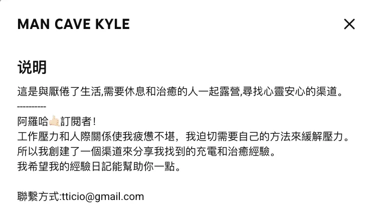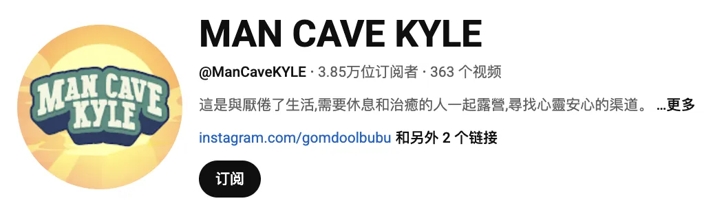 MAN CAVE KYLE是一个以“疗愈系露营”为特色的个人频道,拥有3.85万位订阅者。